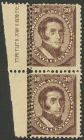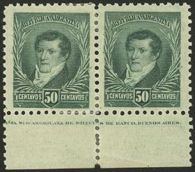 93 ARGENTINA - EMISIONES GENERALES Pareja / Nuevo con bisagra N°Cat.: GJ.184 Valor de catál.: US$50 MB. GJ.184, 1896 50c. Belgrano, hermosa pareja con borde de hoja con leyenda del impresor, muy buena calidad! Precio inicial: US$ 30 Precio actual: US$ 30 Oferte US$ 30 o más