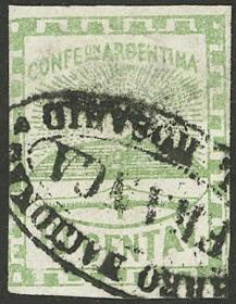 28 ARGENTINA - CONFEDERACIÓN Sello suelto / Usado N°Cat.: GJ.2 Valor de catál.: US$90 Buena-MB GJ.2, 10c. Verde, usado en Rosario, con las firmas de Victor Kneitschel y Alberto Solari al dorso! Precio inicial: US$ 50 Precio actual: US$ 50 Oferte US$ 50 o más