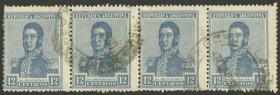 118 ARGENTINA - EMISIONES GENERALES Multiplo / Usado N°Cat.: GJ.518 Valor de catál.: (US$3.000) MB. GJ.518, 1920 San Martín 12c. con filigrana SOL FISCAL, magnífica tira de 4 usada, PIEZA MÁXIMA CONOCIDA, muy buena calidad, extremadamente rara!, valor estimado de mercado US$3.000/3.500 Precio inicial: US$ 1500 Precio actual: US$ 1500 Oferte US$ 1500 o más