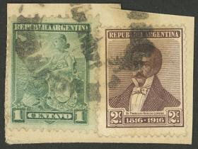 95 ARGENTINA - EMISIONES GENERALES Pieza / Usado N°Cat.: GJ.218 MB. RARA COMBINACIÓN y uso tardío: GJ.218, 1c. Libertad con Escudo + 398 (2c. Centenario de la Independencia, emitido en 1916!!), usados sobre fragmento, muy buena calidad. La combinación de estos 2 valores es extremadamente rara sino única, y el 1c. Libertad está usado unos 15 años después de emitido!! Precio inicial: US$ 25 Precio actual: US$ 25 Oferte US$ 25 o más