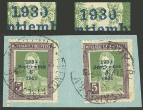 126 ARGENTINA - EMISIONES GENERALES Pieza / Usado N°Cat.: GJ.707 MB. VARIEDAD: GJ.707, 1931 5P. Aniversario de la revolución, 2 sellos sobre fragmento, ambos con la variedad "0 de 1930 roto", muy buena calidad! Precio inicial: US$ 45 Precio actual: US$ 45 Oferte US$ 45 o más