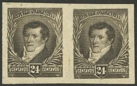 92 ARGENTINA - EMISIONES GENERALES Pareja / Nuevo Mint N°Cat.: GJ.182 Valor de catál.: US$300 MB. GJ.182, 1896 24c. Belgrano con filigrana sol grande, PAREJA SIN DENTAR, nueva mint (+50%), excelente! Precio inicial: US$ 180 Precio actual: US$ 180 Oferte US$ 180 o más