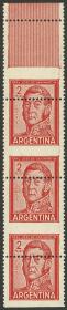 172 ARGENTINA - EMISIONES GENERALES Multiplo / Nuevo Mint N°Cat.: GJ.1131 var. MB. RARO COMPLEMENTO: GJ.1131, 2P. San Martín, tira de 3 con el dentado muy desplazado, lo que produce sellos con el valor facial abajo y un raro complemento arriba, excelente! Precio inicial: US$ 100 Precio actual: US$ 100 Oferte US$ 100 o más
