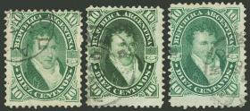 77 ARGENTINA - EMISIONES GENERALES Lote / Usado N°Cat.: GJ.39++ Valor de catál.: US$43++ MB. GJ.39 + 39b + var., 1867 10c. Belgrano, sello normal en color verde, otro en verde MUY OSCURO y papel algo más grueso, y el último en papel listado vertical, muy bonito e inusual conjunto! Precio inicial: US$ 25 Precio actual: US$ 25 Oferte US$ 25 o más