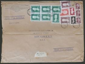 158 ARGENTINA - EMISIONES GENERALES Sobre / N°Cat.: GJ.1021+otros Buena RARO FRANQUEO: Sobre aéreo certificado enviado el 27/JUL/1953 de Bs.Aires a USA con un fabuloso franqueo de 143,30P. que incluye 6x 20P. Eva Perón (GJ.1021) + otros valores de la misma emisión, al dorso arribo el 31/JUL, un sello de 10c defectuoso sino excelente, único y espectacular! Precio inicial: US$ 1000 Precio actual: US$ 1000 Oferte US$ 1000 o más