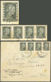 155 ARGENTINA - EMISIONES GENERALES Sobre / N°Cat.: GJ.1004a Buena VARIEDAD EN CARTA: GJ.1004a, 5c. Eva Perón con DOBLE IMPRESIÓN, tira de 4 franqueando un sobre enviado el 11/MAY/1953 de Santa Fe a Buenos Aires, muy interesante! Precio inicial: US$ 50 Precio actual: US$ 50 Oferte US$ 50 o más