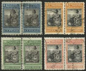 100 ARGENTINA - EMISIONES GENERALES Pareja / Usado N°Cat.: GJ.235/238 Valor de catál.: US$130+ MB. GJ.235/238, 1899 Los 4 valores altos de la emisión Libertad con Escudo en parejas usadas postalmente, muy buena calidad, conjunto inusual! Precio inicial: US$ 85 Precio actual: US$ 85 Oferte US$ 85 o más