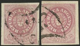 72 ARGENTINA - RIVADAVIAS Pareja / Usado N°Cat.: GJ.33 Buena-MB GJ.33, 7ª Tirada DENTADA, raro color rosa borravino oscuro, pareja con matasello completo de CHASCOMÚS (+300%), con leve doblez solo visible desde el dorso, frente de lujo, gran rareza! Precio inicial: US$ 600 Precio actual: US$ 600 Oferte US$ 600 o más