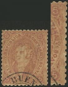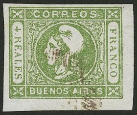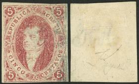 42 ARGENTINA - RIVADAVIAS Sello suelto / Usado N°Cat.: GJ.16f Valor de catál.: US$2.200 MB. RAREZA CON BASE BAJA: GJ.16f, 1ª Tirada sin dentar, impreso sobre papel rayado y con la filigrana invertida, bonito ejemplar con 4 márgenes completos (3 muy amplios), muy fresco, raro. Con la firma de Victor Kentischel y certificado de Alberto Solari, oportunidad por su baja base! Precio inicial: US$ 1600 Precio actual: US$ 1600 Oferte US$ 1600 o más