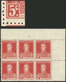 122 ARGENTINA - EMISIONES GENERALES Multiplo / Nuevo Mint N°Cat.: GJ.599d Valor de catál.: US$50+ MB. GJ.599d, 1924 5c. San Martín, bloque de 6, UNO CON PUNTO después del valor, nuevo mint, lujo! Precio inicial: US$ 30 Precio actual: US$ 30 Oferte US$ 30 o más