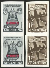 167 ARGENTINA - EMISIONES GENERALES Pareja / Nuevo Mint N°Cat.: GJ.1102P/3P Valor de catál.: US$80 MB. GJ.1102P/1103P, 1958 Amistad entre Argentina y Bolivia (tren, avión, escudos y mapa), serie de 2 PAREJAS SIN DENTAR, MB calidad! Precio inicial: US$ 50 Precio actual: US$ 50 Oferte US$ 50 o más