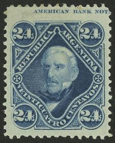 83 ARGENTINA - EMISIONES GENERALES Sello suelto / Nuevo con bisagra N°Cat.: GJ.55 MB. GJ.55, 1877 24c. San Martín, sello de tamaño jumbo con parte de la leyenda del impresor en el margen superior, excelente! Precio inicial: US$ 30 Precio actual: US$ 30 Oferte US$ 30 o más
