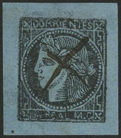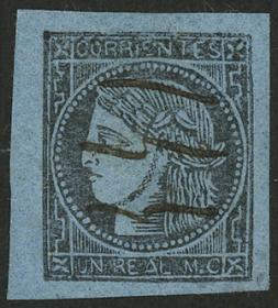 19 ARGENTINA - CORRIENTES Sello suelto / Usado N°Cat.: GJ.1 Valor de catál.: US$45 MB. GJ.1, Un Real azul, tipo 3, obliterado a pluma, muy buena calidad! Precio inicial: US$ 30 Precio actual: US$ 30 Oferte US$ 33 o más