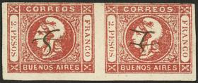80 ARGENTINA - EMISIONES GENERALES Pareja / Sin usar (sin goma) N°Cat.: GJ.47 var. Buena GJ.47, 1877 Provisorio de 8c., pareja con la SOBRECARGA MUY DESPLAZADA (a caballo del dentado!!), nueva sin goma, MB calidad (el sello derecho con el borde inferior cortado a tijera), espectacular y rara variedad! Precio inicial: US$ 200 Precio actual: US$ 200 Oferte US$ 200 o más