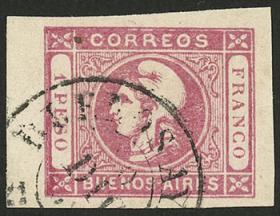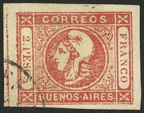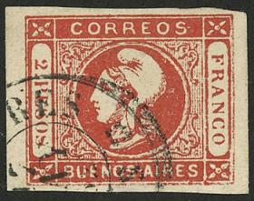 14 ARGENTINA - CABECITAS Sello suelto / Usado N°Cat.: GJ.18 Valor de catál.: US$135 MB. GJ.18, 2P. Rojo, hermoso sello de 4 márgenes amplios, con matasello fechador de Buenos Aires, muy buena calidad! Precio inicial: US$ 75 Precio actual: US$ 75 Oferte US$ 83 o más