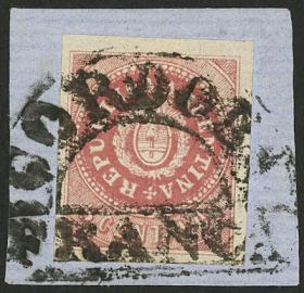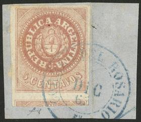 41 ARGENTINA - ESCUDITOS Pieza / Usado N°Cat.: GJ.15A MB. GJ.15A, 5c. Con la C estrecha color ROJO MORADO y con RETOQUES en las letras "ENT" de CENTAVOS, sobre fragmento usado en Rosario, lujo! Precio inicial: US$ 50 Precio actual: US$ 50 Oferte US$ 50 o más