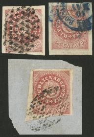 37 ARGENTINA - ESCUDITOS Lote / Usado N°Cat.: GJ.15 Valor de catál.: US$99+ MB. GJ.15, 5c. Con la C estrecha, 3 sellos usados (uno sobre fragmento), distintos colores (rosa, rojo pálido, y rojo), diferentes matasellos, lujo! Precio inicial: US$ 60 Precio actual: US$ 60 Oferte US$ 60 o más