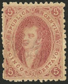 67 ARGENTINA - RIVADAVIAS Sello suelto / Sin usar (sin goma) N°Cat.: GJ.26 Valor de catál.: US$120 MB. GJ.26, 5ª Tirada típico de hermoso color carmín oscuro, nuevo, lujo! Precio inicial: US$ 80 Precio actual: US$ 80 Oferte US$ 80 o más