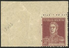 119 ARGENTINA - EMISIONES GENERALES Sello suelto / Nuevo Mint N°Cat.: GJ.572 MB. BELLEZA: GJ.572, 1923 30c. San Martín con punto, esquina de hoja con grandes bordes, nuevo mint (suave marquita en el borde de hoja), lujo! Precio inicial: US$ 25 Precio actual: US$ 25 Oferte US$ 25 o más