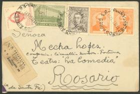940 ARGENTINA - HISTORIA POSTAL Sobre / N°Cat.: MB. Sobre certificado enviado desde Rosario a Copenhague (Dinamarca) el 9/ABR/1934, con franqueo de 55c. formado por sellos de varias emisiones, MB calidad Precio inicial: US$ 25 Precio actual: US$ 25 Oferte US$ 25 o más