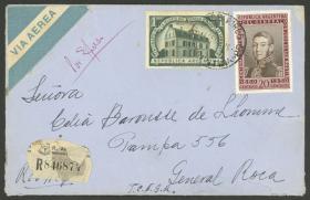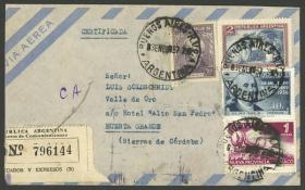 961 ARGENTINA - HISTORIA POSTAL Sobre / N°Cat.: MB. 3/ENE/1957: Buenos Aires - Huerta Grande (Córdoba), sobre certificado con franqueo de $3,60 formado por sellos de las series Próceres y Riquezas Nacionales I y II y emisiones conmemorativas, MB calidad Precio inicial: US$ 10 Precio actual: US$ 10 Oferte US$ 10 o más