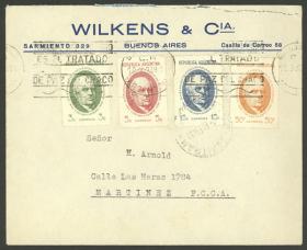 942 ARGENTINA - HISTORIA POSTAL Sobre / N°Cat.: MB. Sobre circulado en Buenos Aires el 10/SEP/1938, franqueado con los 4 valores de la serie "Cincuentenario del Fallecimiento de Sarmiento" (total 73c.), MB calidad Precio inicial: US$ 25 Precio actual: US$ 25 Oferte US$ 25 o más