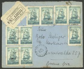 943 ARGENTINA - HISTORIA POSTAL Sobre / N°Cat.: MB. 23/MAR/1939: Córdoba - Buenos Aires, sobre certificado, con 9x 5c. "Fragata Presidente Sarmiento", MB calidad Precio inicial: US$ 20 Precio actual: US$ 20 Oferte US$ 20 o más
