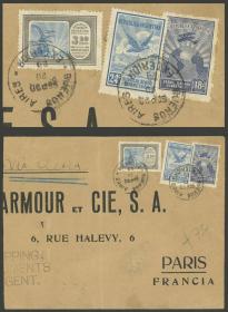 929 ARGENTINA - HISTORIA POSTAL Sobre / N°Cat.: MB. Gran parte de un sobre enviado en septiembre 1920 desde Buenos Aires a Paris, con 18c., 24c. y $3,60 "Servicio Aéreo, Sobretasa", MB calidad Precio inicial: US$ 25 Precio actual: US$ 25 Oferte US$ 25 o más