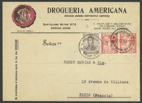 930 ARGENTINA - HISTORIA POSTAL Sobre / N°Cat.: MB. Sobre con membrete publicitario impreso (droguería), enviado el 5/OCT/1922 desde Buenos Aires a Paris, con 2c. "San Martín" y pareja de 5c. "1º Congreso Postal Panamericano", MB calidad Precio inicial: US$ 20 Precio actual: US$ 20 Oferte US$ 20 o más