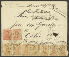 927 ARGENTINA - HISTORIA POSTAL Sobre / N°Cat.: MB. ENE/1920: Alvear (Corrientes)- Colón (Entre Ríos), sobre certificado, franqueado con 7x 1c. y 2x 5c. "San Martín" (total 17c.), MB calidad Precio inicial: US$ 25 Precio actual: US$ 25 Oferte US$ 25 o más