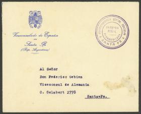 935 ARGENTINA - HISTORIA POSTAL Sobre / N°Cat.: MB. Sobre circulado en Santa Fe, enviado por el Viceconsulado de España al Viceconsul de Alemania, con matasello de Franquicia Postal, MB calidad Precio inicial: US$ 10 Precio actual: US$ 10 Oferte US$ 10 o más