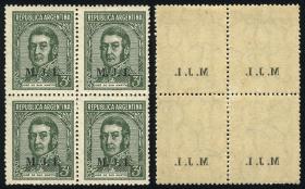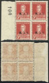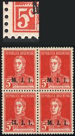 815 ARGENTINA - SERVICIO OFICIAL Multiplo / Nuevo Mint N°Cat.: GJ.300 Valor de catál.: 142+ MB. GJ.300, Ministerio del Interior, 5c. San Martín, dentado 13¼, bloque de 28 sellos, 5 de ellos con filigrana Serra Bond (completa!!), MINT, MB calidad Precio inicial: US$ 90 Precio actual: US$ 90 Oferte US$ 90 o más