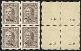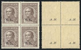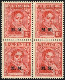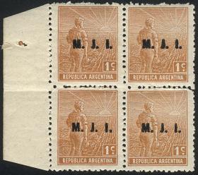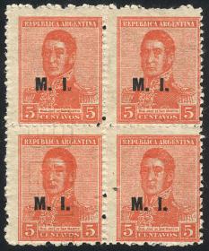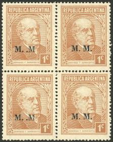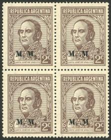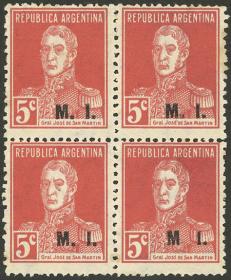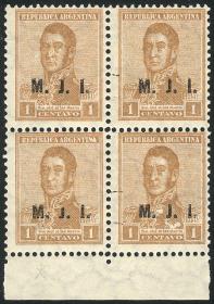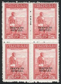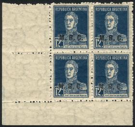 843 ARGENTINA - SERVICIO OFICIAL Cuadro / Nuevo Mint N°Cat.: GJ.600 MB. GJ.612, Ministerio de Relaciones Exteriores y Culto, letras tipo bastón, San Martín 12c. con punto después del valor, dentado 13¼, espectacular cuadro MINT esquina de hoja, MB calidad Precio inicial: US$ 3 Precio actual: US$ 3 Oferte US$ 3 o más