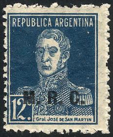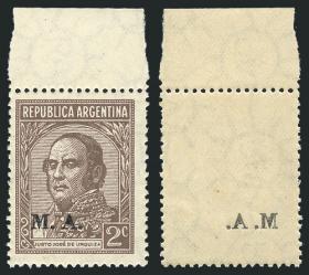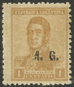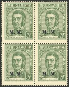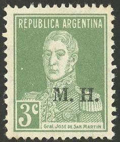 836 ARGENTINA - SERVICIO OFICIAL Cuadro / Nuevo con bisagra N°Cat.: GJ.507a Valor de catál.: 7+ MB. GJ.507a, 3c. San Martín, sobrecarga "M.M.", cuadro con 2 sellos con variedad error "M..M", MB calidad Precio inicial: US$ 3 Precio actual: US$ 3 Oferte US$ 3 o más