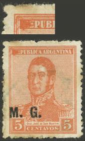 807 ARGENTINA - SERVICIO OFICIAL Sello suelto / Usado N°Cat.: GJ.152 MB. GJ.152, 5c. San Martín, Ministerio de Guerra, sin filigrana, dentado 13¼x12½, con variedad mancha sobre "RE" de "REPUBLICA", usado, MB calidad Precio inicial: US$ 5 Precio actual: US$ 5 Oferte US$ 5 o más