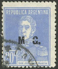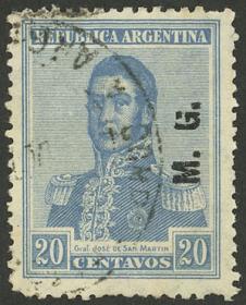 811 ARGENTINA - SERVICIO OFICIAL Sello suelto / Usado N°Cat.: GJ.187 MB. GJ.187, 20c. San Martín, sin punto, Ministerio de Guerra, con variedad "G" incompleta, usado, MB calidad Precio inicial: US$ 3 Precio actual: US$ 3 Oferte US$ 3 o más