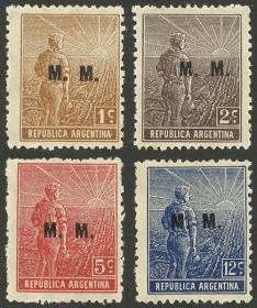 828 ARGENTINA - SERVICIO OFICIAL Serie / Nuevo con bisagra N°Cat.: GJ.451/4 Valor de catál.: 11+ MB. GJ.451/4, Labrador, Ministerio de Marina, papel alemán, filigrana hexágonos verticales, dentado 13¼x12½, serie de 4 valores completa, MB calidad Precio inicial: US$ 5 Precio actual: US$ 5 Oferte US$ 5 o más