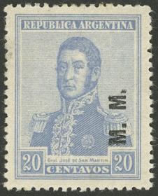 806 ARGENTINA - SERVICIO OFICIAL Sello suelto / Nuevo con bisagra N°Cat.: GJ.151 MB. GJ.151, 1c. San Martín, Ministerio de Guerra, con variedad sobrecarga con "M" incompleta, MB calidad Precio inicial: US$ 5 Precio actual: US$ 5 Oferte US$ 5 o más