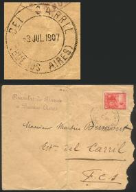 922 ARGENTINA - HISTORIA POSTAL Sobre / N°Cat.: Buena Sobre enviado el 2/JUL/1907 por el Consulado de Francia en Bueno sAires a ESTACIÓN DEL CARRIL, franqueado con GJ.222, al dorso con la rara marca doble círculo: "DEL CARRIL - BUENOS AIRES", muy bonito! Precio inicial: US$ 15 Precio actual: US$ 15 Oferte US$ 17 o más