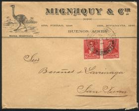 911 ARGENTINA - HISTORIA POSTAL Sobre / N°Cat.: MB. Sobre con lindo membrete al frente: "Mignaquy y Cía", franqueado con pareja del 5c. de la serie "3 Próceres", enviado el 4/AGO/1896 de Buenos Aires a San Juan, excelente calidad! Precio inicial: US$ 15 Precio actual: US$ 15 Oferte US$ 15 o más
