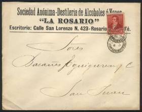 912 ARGENTINA - HISTORIA POSTAL Sobre / N°Cat.: MB. Sobre con lindo membrete al frente: "Sociedad Anónima - DESTILERÍA DE ALCOHOLES A VAPOR La Rosario", franqueado con 5c. de la serie "3 Próceres", enviado el 4/SEP/1897 de Rosario a San Juan, excelente calidad! Precio inicial: US$ 15 Precio actual: US$ 15 Oferte US$ 17 o más