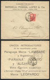 916 ARGENTINA - HISTORIA POSTAL Sobre / N°Cat.: MB. Sobre con publicidad impresa al frente y dorso: "Yerba paraguaya, VINO, Kerosene, etc.", franqueado con 5c. Libertad con Escudo y enviado el 24/MAY/1901 de Buenos Aires a San Juan, MB calidad! Precio inicial: US$ 25 Precio actual: US$ 25 Oferte US$ 25 o más