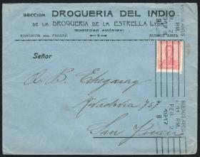 925 ARGENTINA - HISTORIA POSTAL Sobre / N°Cat.: MB. Sobre con lindo membrete comercial: "Droguería Del Indio", franqueado con 5c. San Martín y enviado el 2/FEB/1917 de Buenos Aires a San Juan, excelente! Precio inicial: US$ 10 Precio actual: US$ 10 Oferte US$ 10 o más