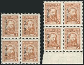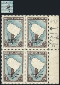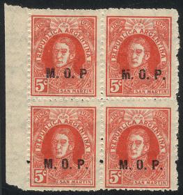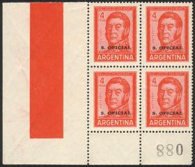826 ARGENTINA - SERVICIO OFICIAL Multiplo / Nuevo con bisagra N°Cat.: GJ.428 Valor de catál.: US$ 50 Buena GJ.428, 30c. San Martín sin punto después del valor, dentado 13¼x12½, con sobrecarga levemente desplazada, en bloque de 100 sellos, con bordes de hoja y número de plancha, algunos puntitos de óxido Precio inicial: US$ 10 Precio actual: US$ 10 Oferte US$ 10 o más
