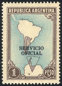 850 ARGENTINA - SERVICIO OFICIAL Sello suelto / Nuevo Mint N°Cat.: GJ.677 MB. GJ.677, Mapa con Antártida 1 peso, papel mate nacional, filigrana sol redondo, con VARIEDAD contorno de América Central omitido, MB calidad Precio inicial: US$ 10 Precio actual: US$ 10 Oferte US$ 11 o más