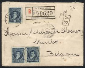 914 ARGENTINA - HISTORIA POSTAL Sobre / N°Cat.: MB. Sobre certificado con AR enviado el 18/JUN/1898 a Bélgica con franqueo de 36c. (GJ.196 x3, DENTADO 12), MB calidad! Precio inicial: US$ 30 Precio actual: US$ 30 Oferte US$ 30 o más