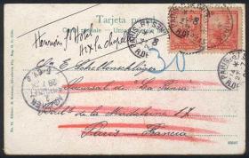 920 ARGENTINA - HISTORIA POSTAL Sobre / N°Cat.: MB. Tarjeta postal con vista de "Buenos Aires - Belgrano - La Barranca", franq. con pareja GJ.222 y enviada el 2/JUL/1906 a Paris, Francia, y redirigida a Aachen (Alemania). Tiene un matasello francés sobre los sellos argentinos, MB calidad! Precio inicial: US$ 15 Precio actual: US$ 15 Oferte US$ 15 o más