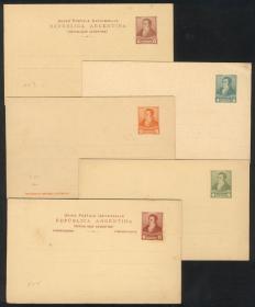 907 ARGENTINA - ENTEROS POSTALES Serie / N°Cat.: Buena Tarjetas con el imagen de Rivadavia, tipografiadas por la Compañía Sudamericana de Billetes de Bs As, sobre cartón color crema, serie COMPLETA de 4 valores, incluye el valor alto (único) con respuesta paga, alguno con leves manchitas Precio inicial: US$ 10 Precio actual: US$ 10 Oferte US$ 10 o más
