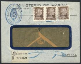 958 ARGENTINA - HISTORIA POSTAL Sobre / N°Cat.: Buena Sobre OFICIAL del Ministerio de Marina, franqueado con $1,50, GJ.694 tira de 3, diferentes marcas al frente y dorso del mencionado ministerio + sello autografiado de control, todos en color azul, MB calidad!! Precio inicial: US$ 10 Precio actual: US$ 10 Oferte US$ 10 o más