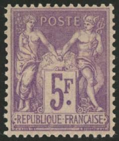 215 FRANCIA - EMISIONES GENERALES Sello suelto / Nuevo con bisagra N°Cat.: Yvert 95 Valor de catál.: Euros 600 MB. Yvert 95, 1877/80 5Fr. Violeta sobre lila, suave marquita de bisagra, muy buena calidad, valor de catálogo Yvert Euros 600 Precio inicial: US$ 150 Precio actual: US$ 155 Oferte US$ 171 o más | |